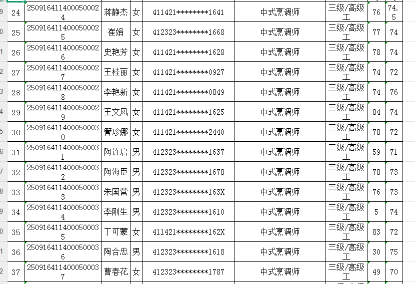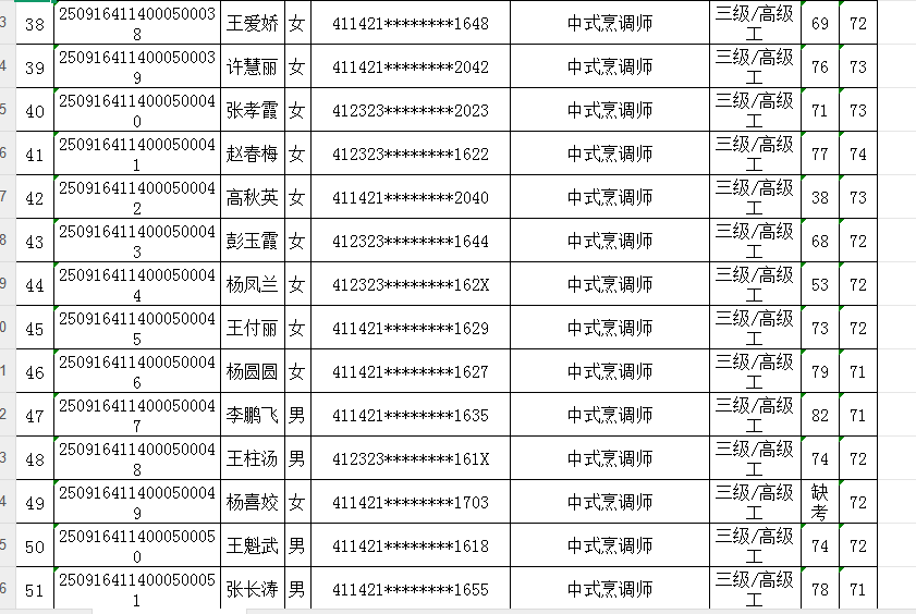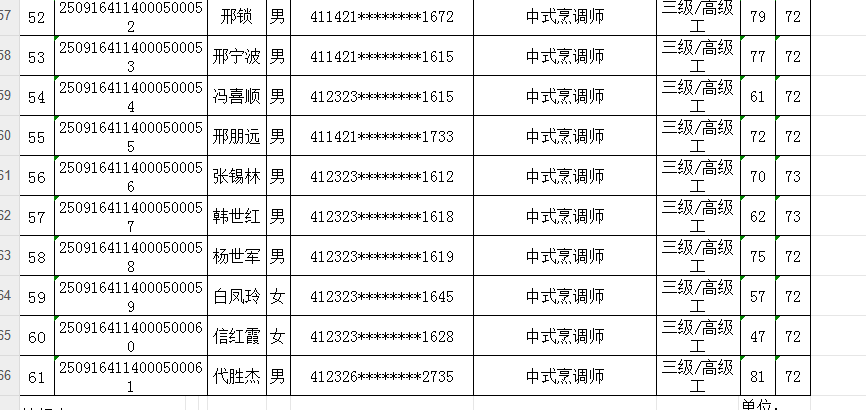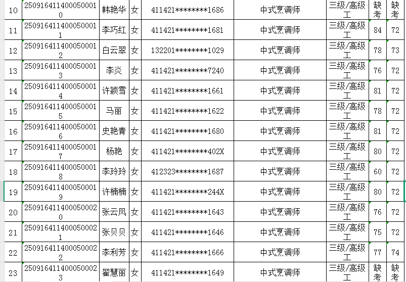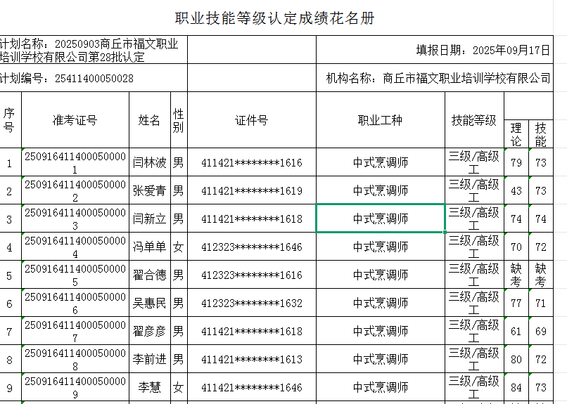 按照《人力资源按照《人力资源和社会保障部职业技能等级认定工作规程(试行)》相关规定,现将2025年9月16日中式烹调师职业技能等级认定考试成绩
