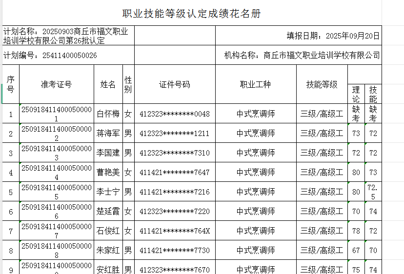 商丘市福文职业培训学校技鉴定中心2025年9月18日职业商丘定成绩公示技能等级认定