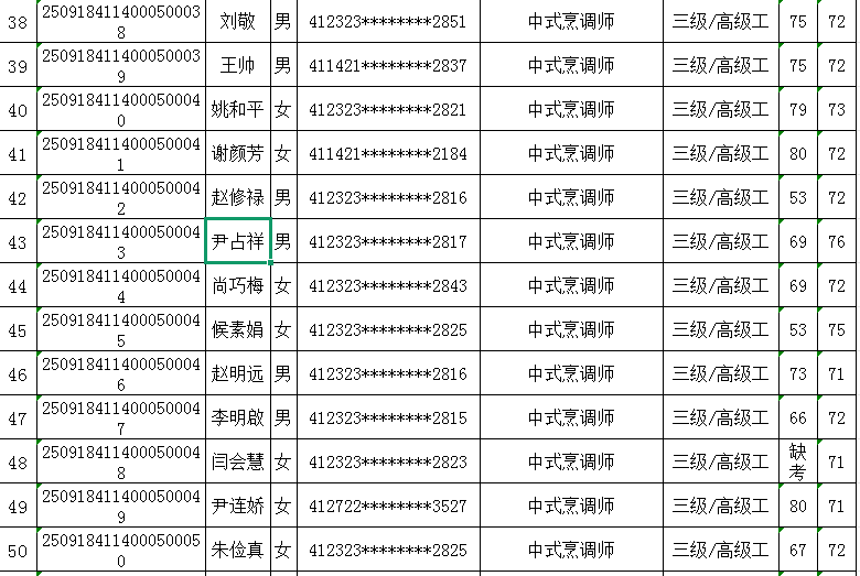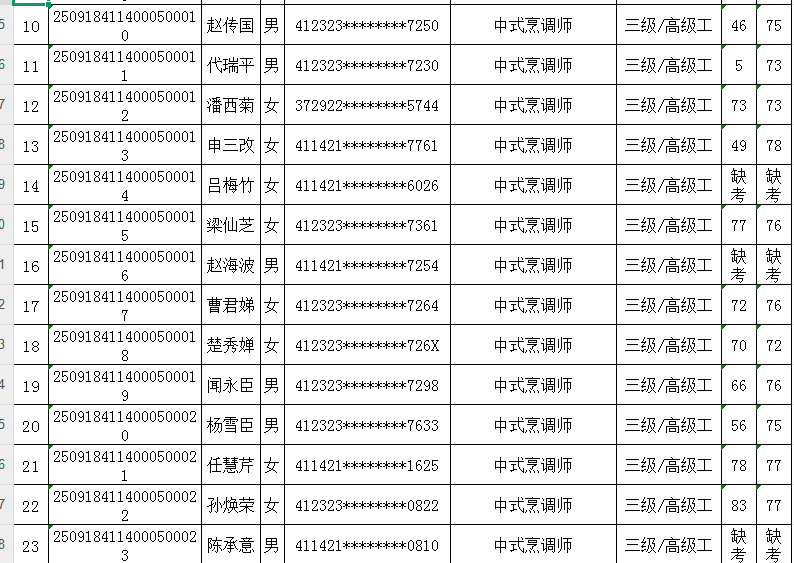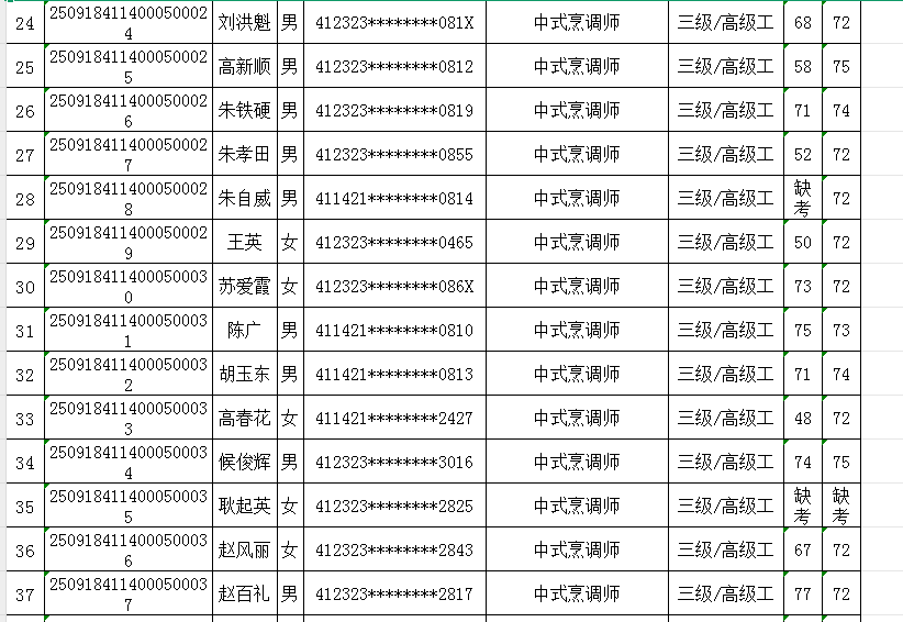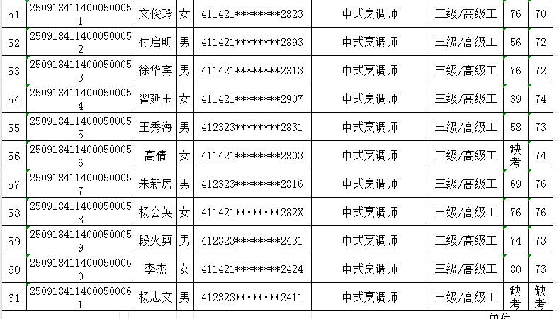 按照《人力资源按照《人力资源和社会保障部职业技能等级认定工作规程(试行)》相关规定,现将2025年9月18日中式烹调师职业技能等级认定考试成绩