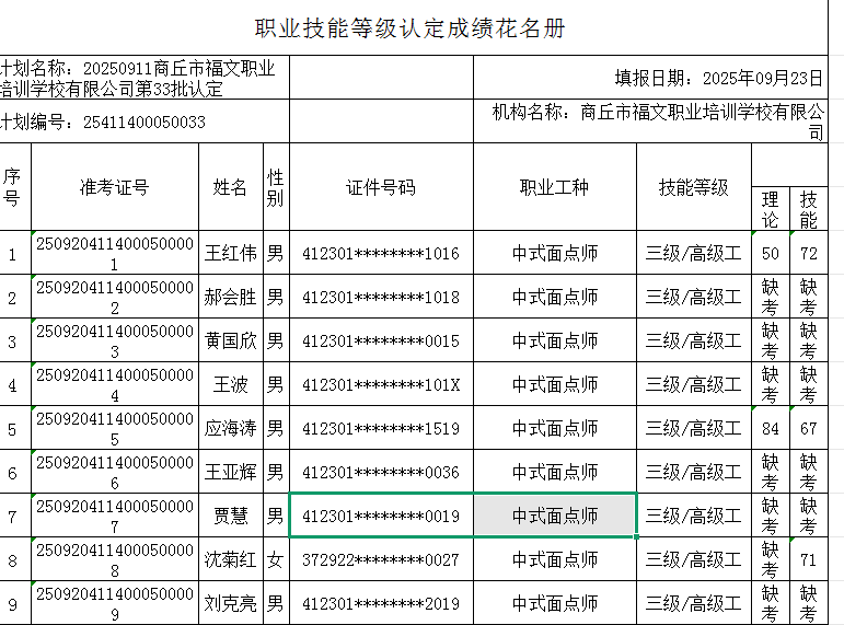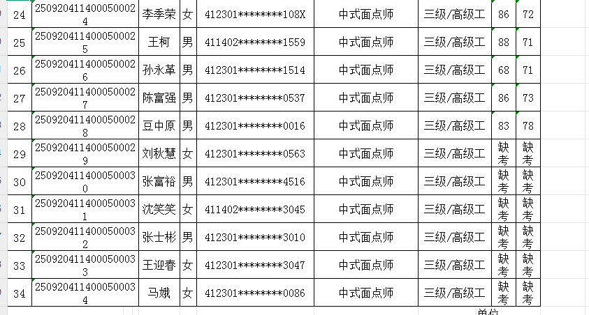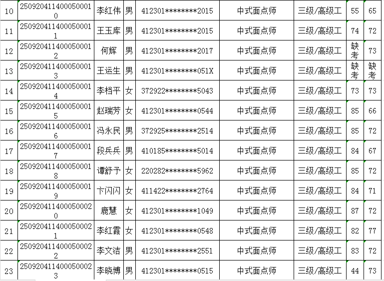 按照《人力资源按照《人力资源和社会保障部职业技能等级认定工作规程(试行)》相关规定,现将2025年9月20日中式面点师职业技能等级认定考试成绩