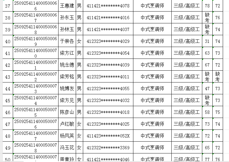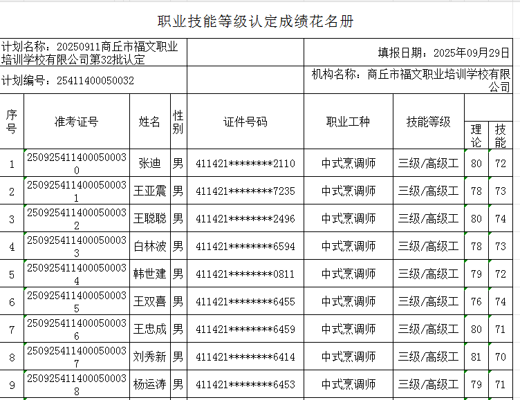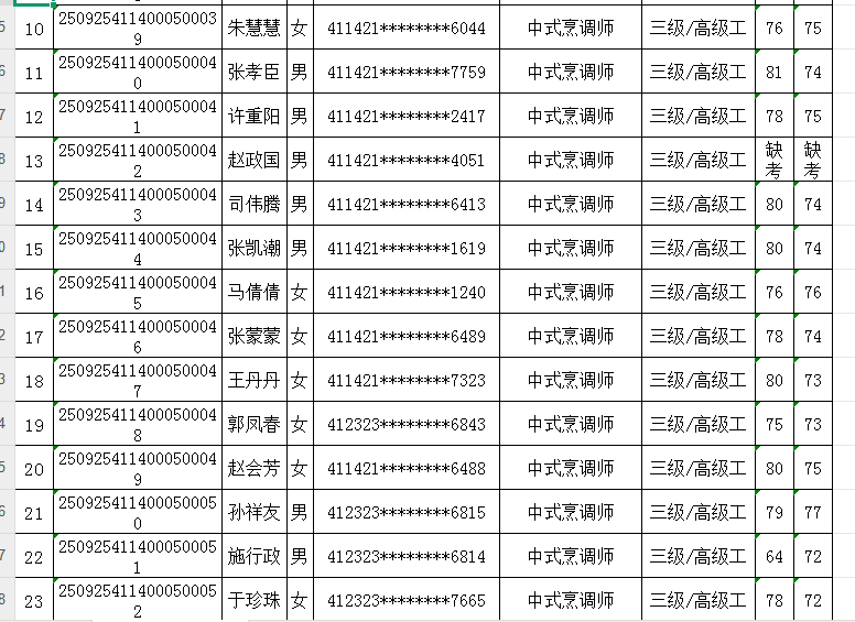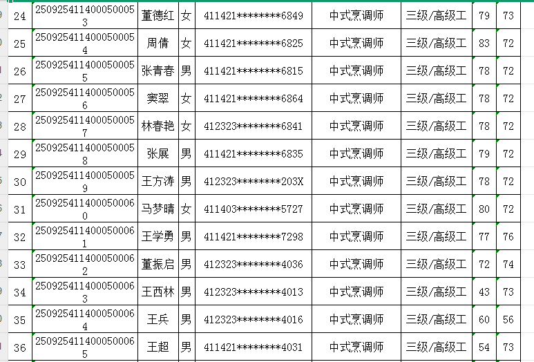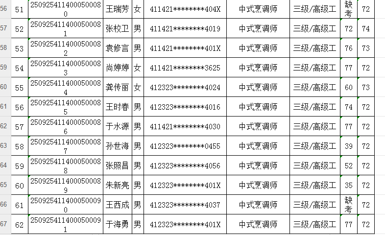 按照《人力资源按照《人力资源和社会保障部职业技能等级认定工作规程(试行)》相关规定,现将2025年9月25日中式烹调师职业技能等级认定考试成绩