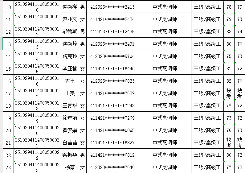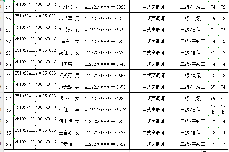 按照《人力资源按照《人力资源和社会保障部职业技能等级认定工作规程(试行)》相关规定,现将2025年10月29日中式烹调师职业技能等级认定考试成绩