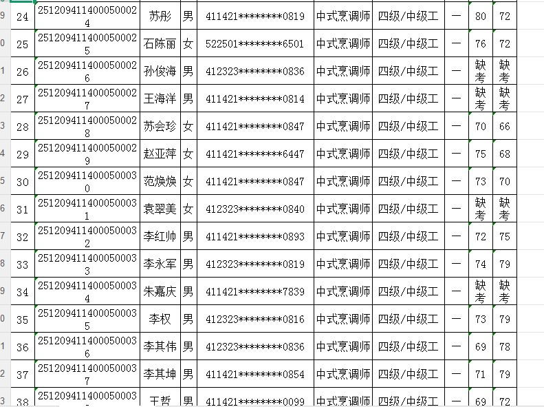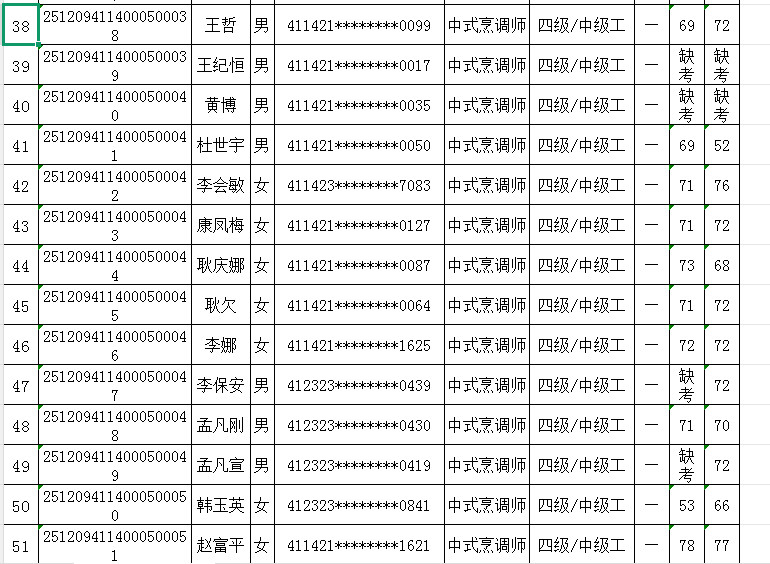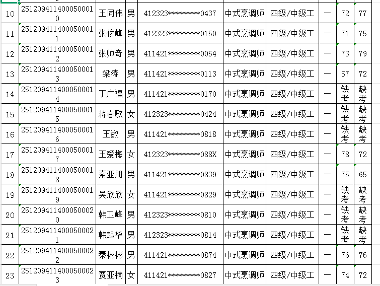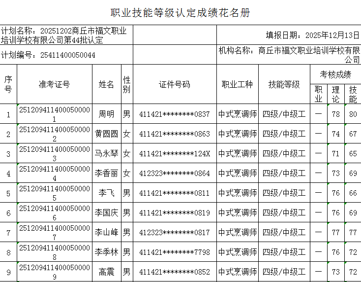 按照《人力资源按照《人力资源和社会保障部职业技能等级认定工作规程(试行)》相关规定,现将2025年12月09日中式烹调师职业技能等级认定考试成绩