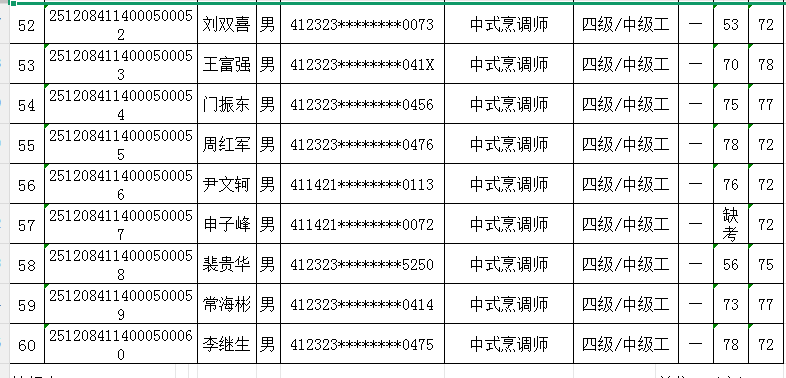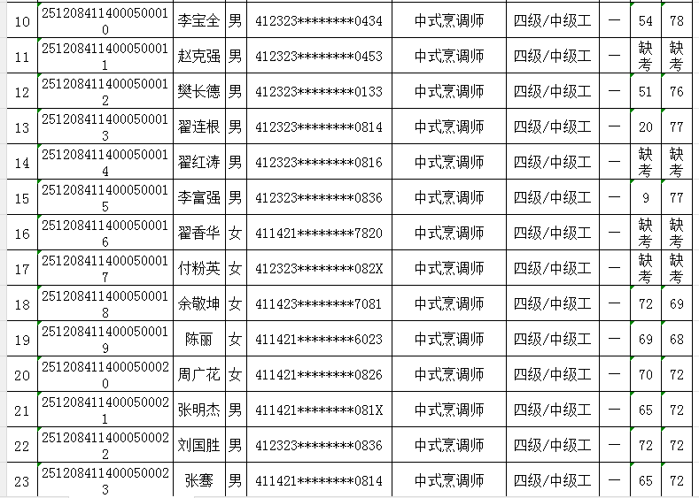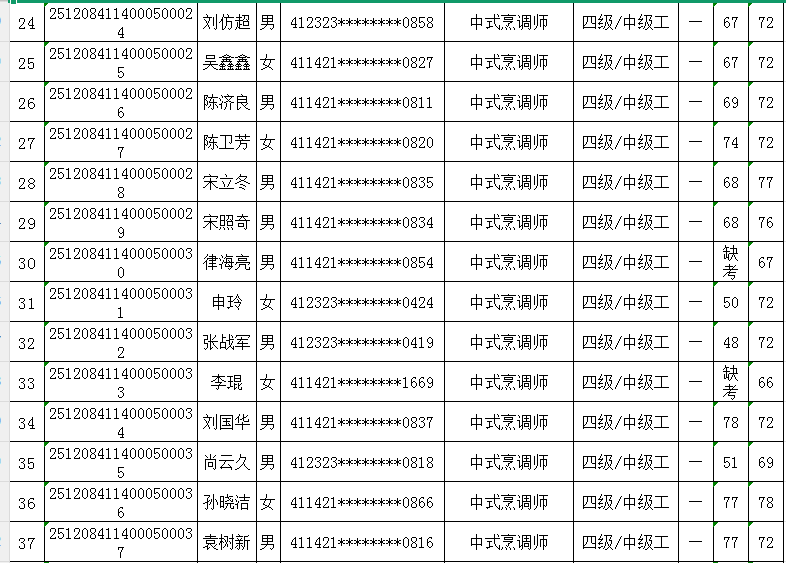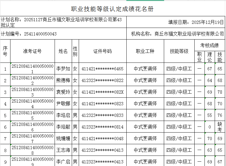 按照《人力资源按照《人力资源和社会保障部职业技能等级认定工作规程(试行)》相关规定,现将2025年12月08日中式烹调师职业技能等级认定考试成绩