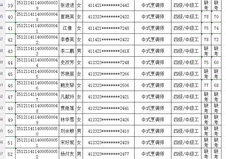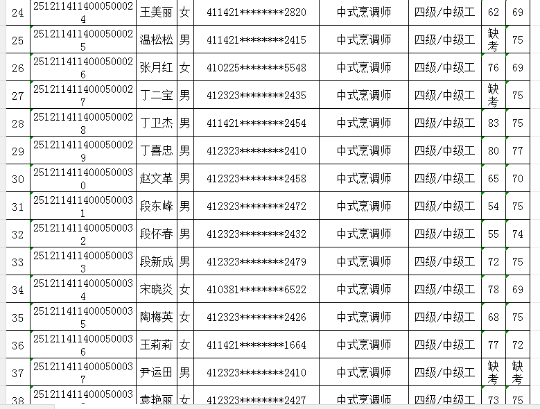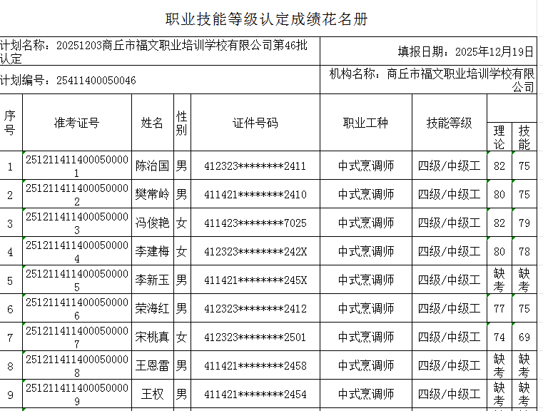 按照《人力资源按照《人力资源和社会保障部职业技能等级认定工作规程(试行)》相关规定,现将2025年12月11日中式烹调师职业技能等级认定考试成绩