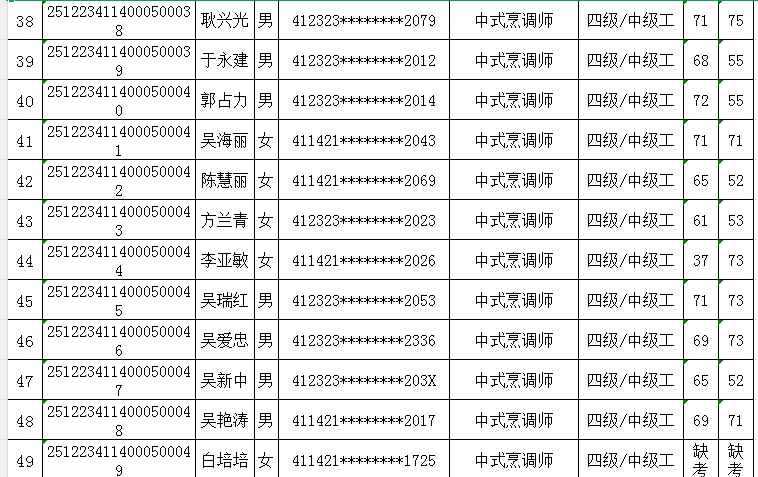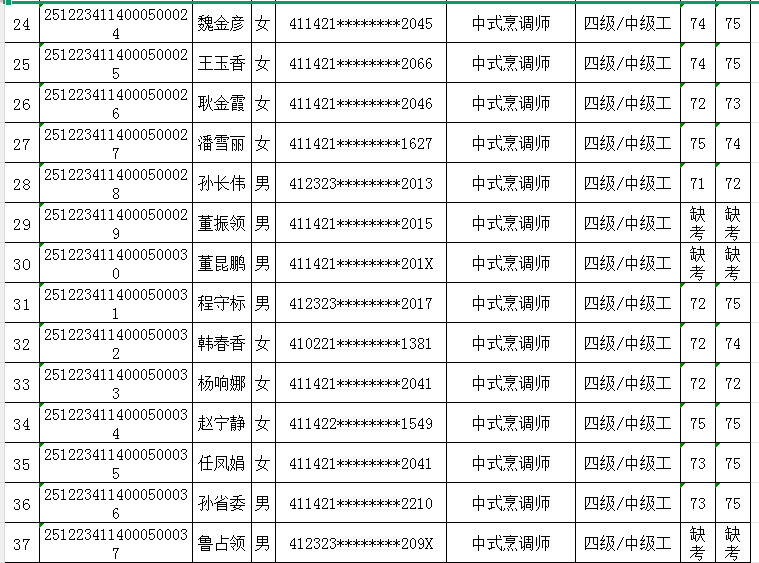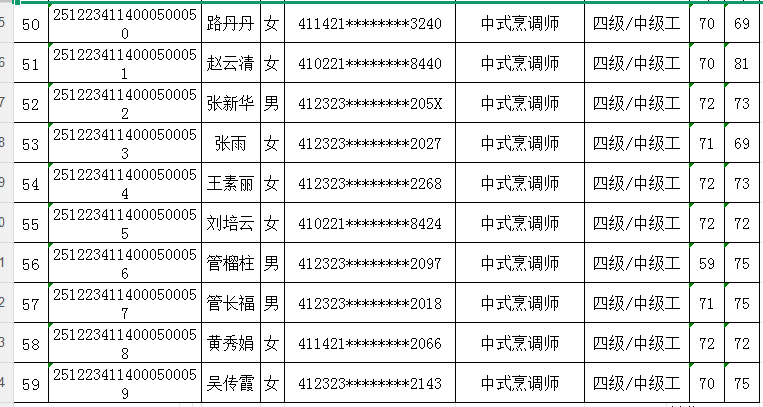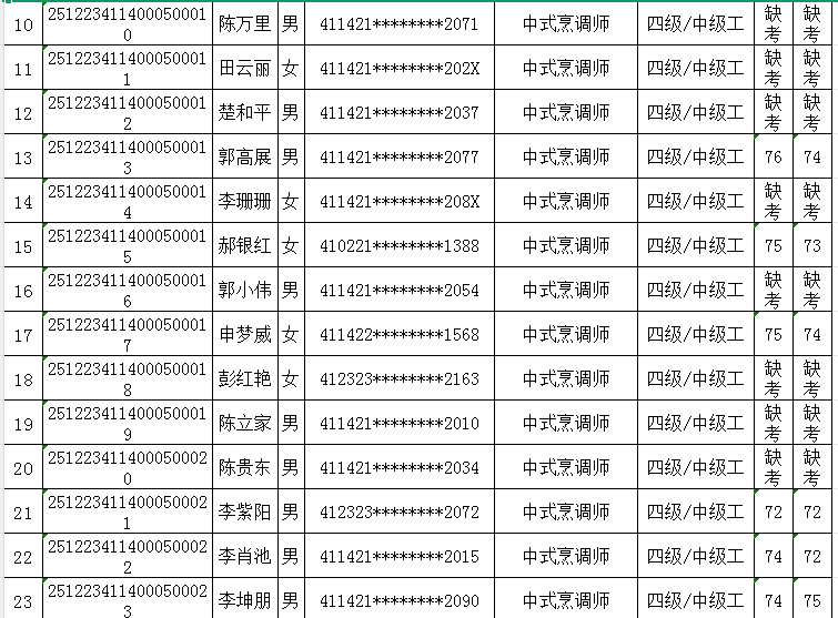 按照《人力资源按照《人力资源和社会保障部职业技能等级认定工作规程(试行)》相关规定,现将2025年12月23日中式烹调师职业技能等级认定考试成绩