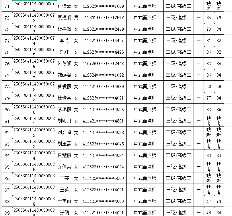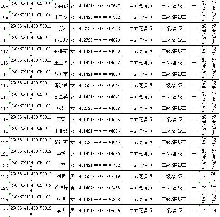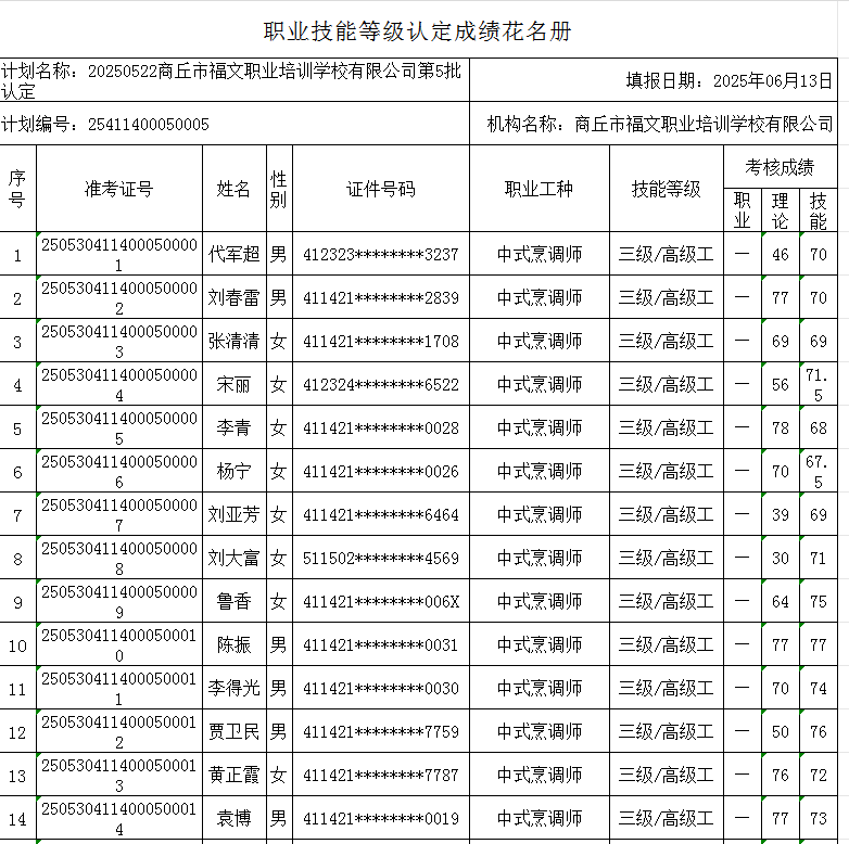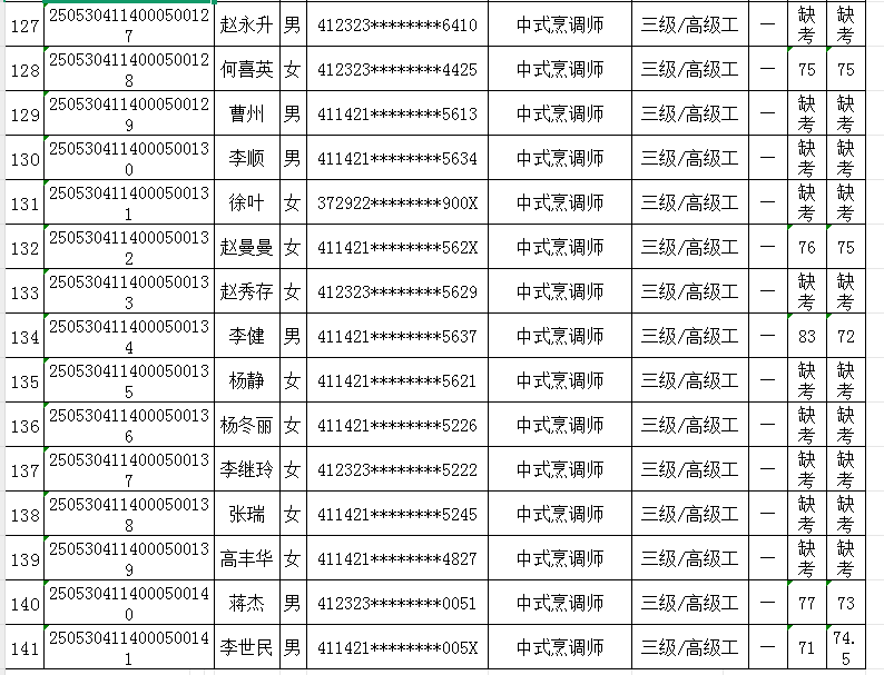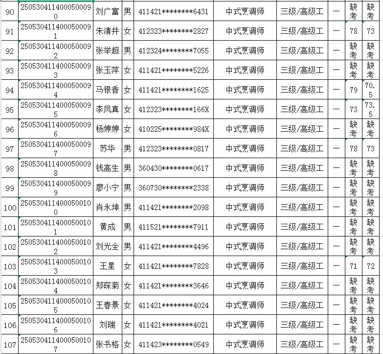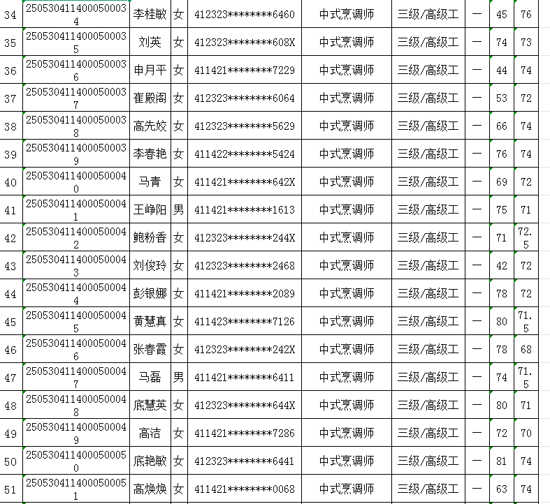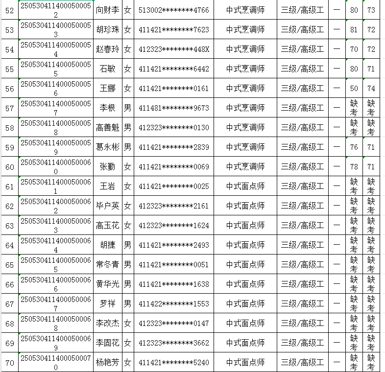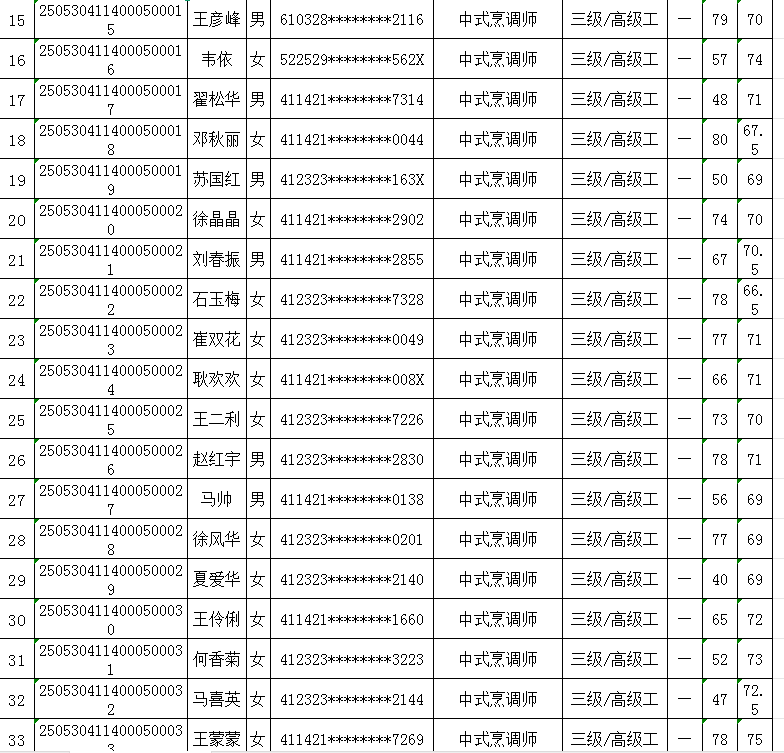 按照《人力资源按照《人力资源和社会保障部职业技能等级认定工作规程(试行)》相关规定,现将2025年5月30日中式烹调师职业技能等级认定考试成绩