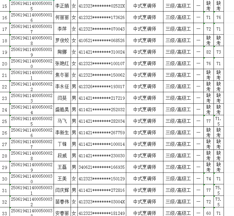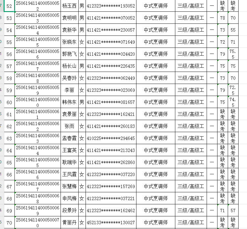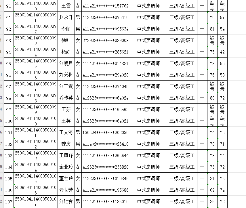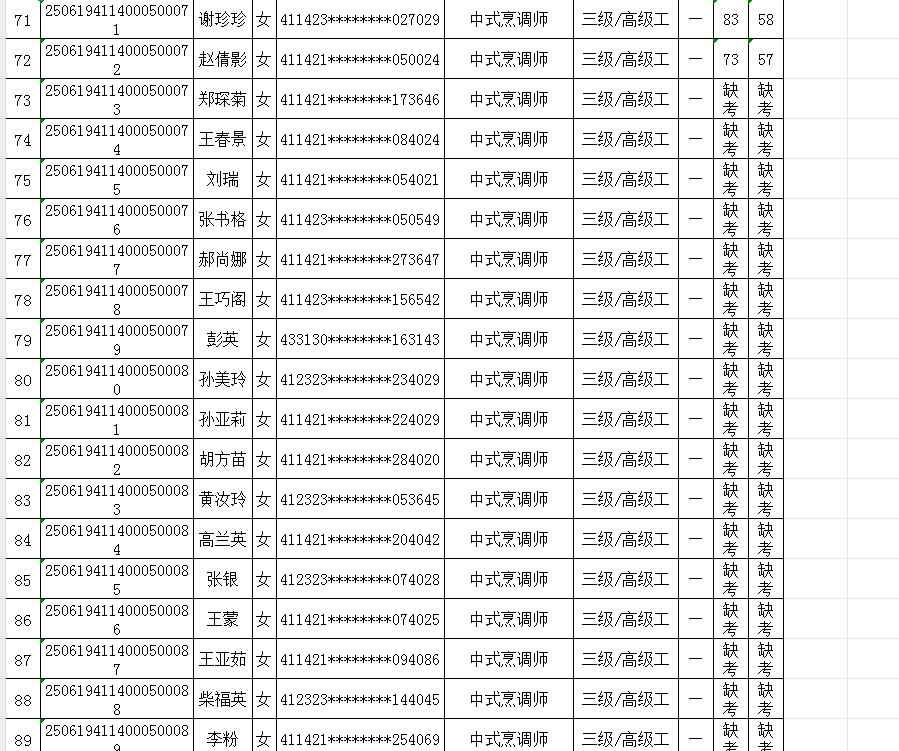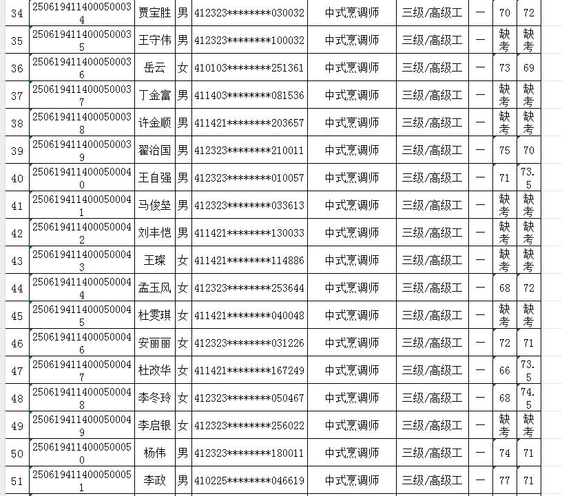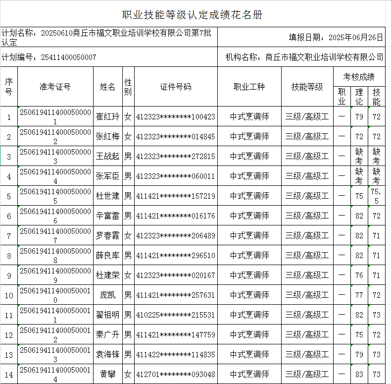 按照《人力资源按照《人力资源和社会保障部职业技能等级认定工作规程(试行)》相关规定,现将2025年6月19日中式烹调师职业技能等级认定考试成绩公示如下,公示期自发布之日起5个工作日期间若有异议,请以书面方式向我校反映。受理异议