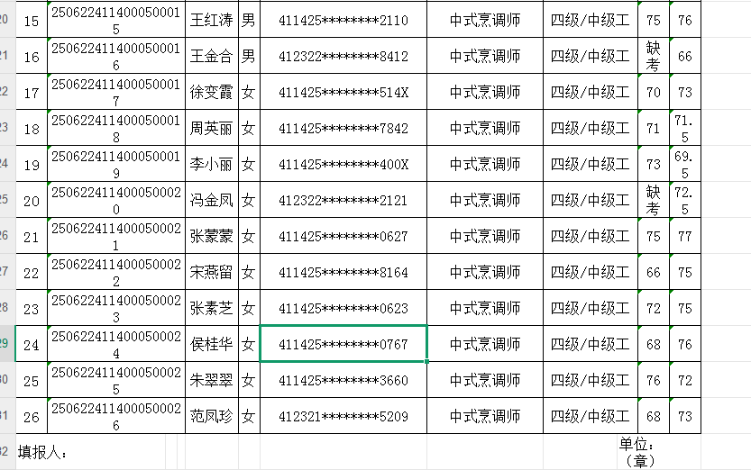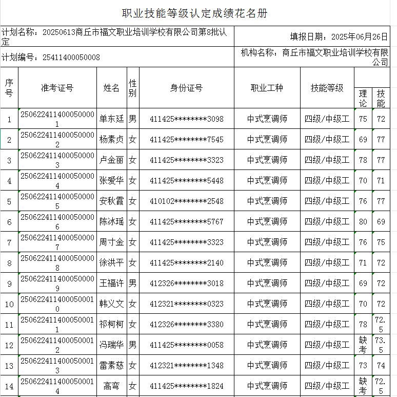 按照《人力资源按照《人力资源和社会保障部职业技能等级认定工作规程(试行)》相关规定,现将2025年6月22日中式烹调师职业技能等级认定考试成绩公示如下,公示期自发布之日起5个工作日期间若有异议,请以书面方式向我校反映。受理异议