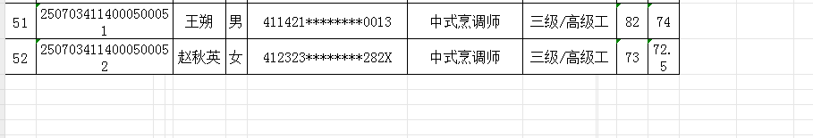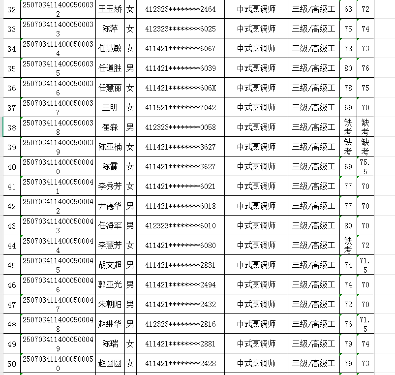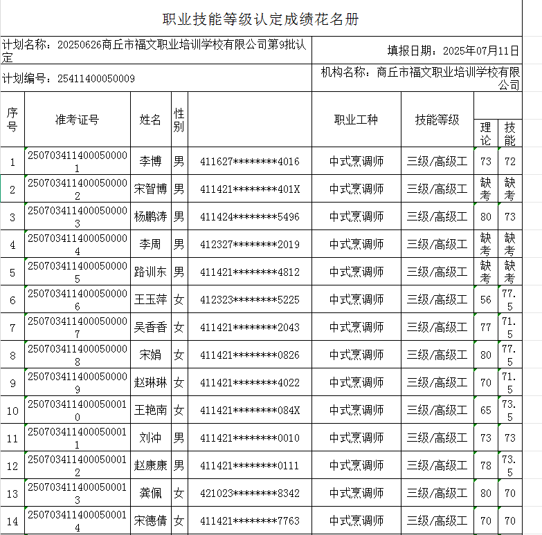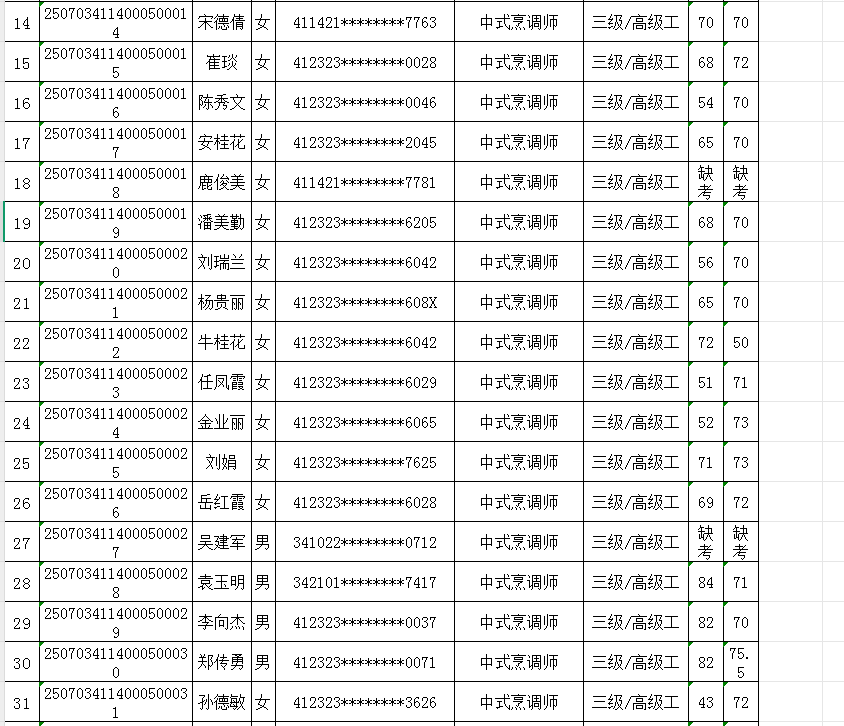 按照《人力资源按照《人力资源和社会保障部职业技能等级认定工作规程(试行)》相关规定,现将2025年7月4日中式烹调师职业技能等级认定考试成绩公示如下,公示期自发布之日起5个工作日期间若有异议,请以书面方式向我校反映。受理异议