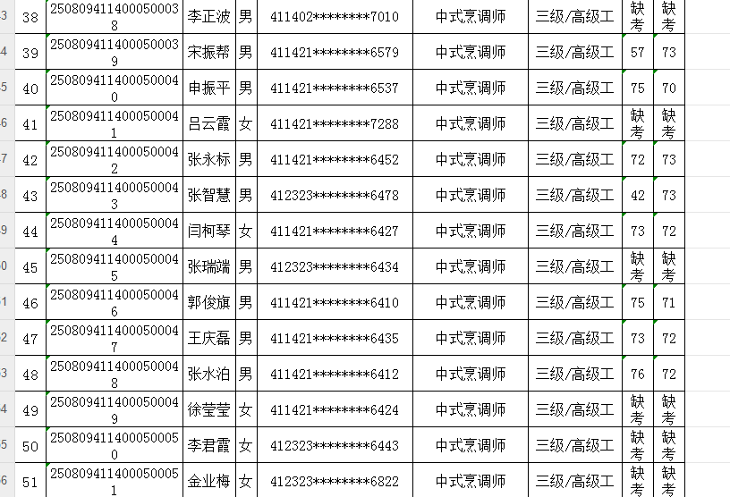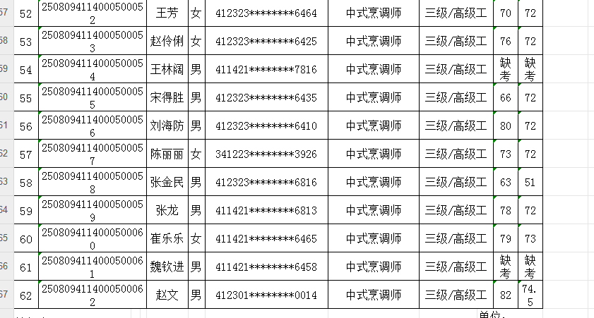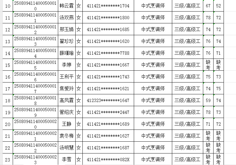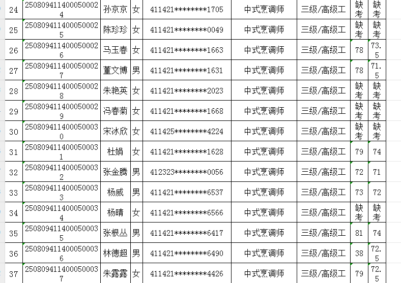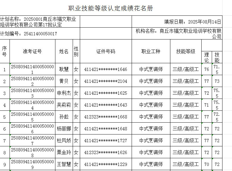 按照《人力资源按照《人力资源和社会保障部职业技能等级认定工作规程(试行)》相关规定,现将2025年8月9日中式烹调师职业技能等级认定考试成绩