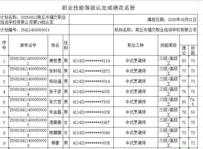 商丘市福文职业培训学校技鉴定中心2025年8月18日职业商丘定成绩公示技能等级认定