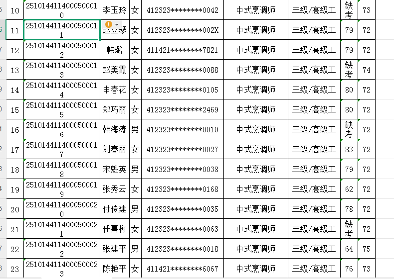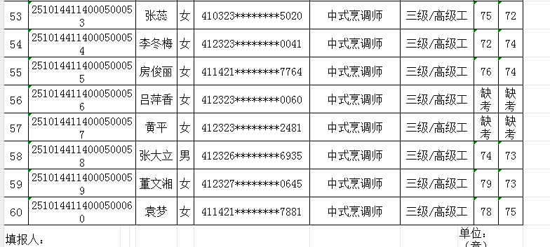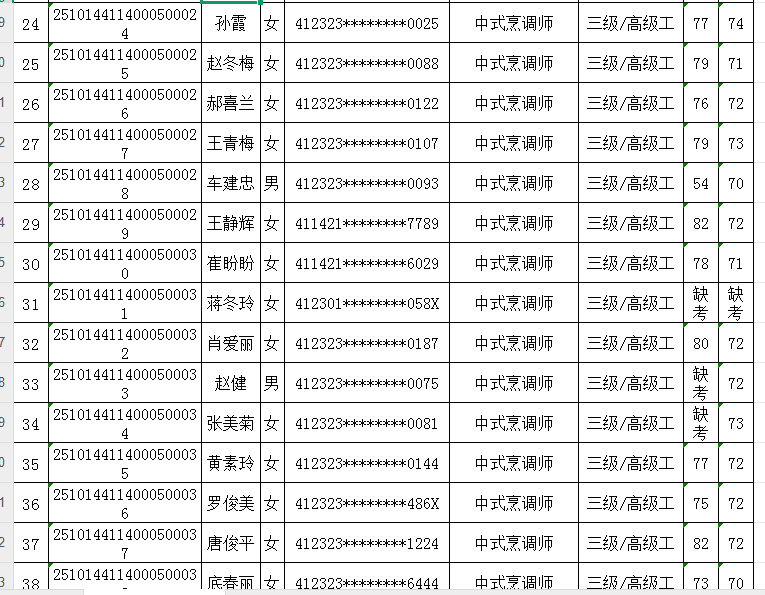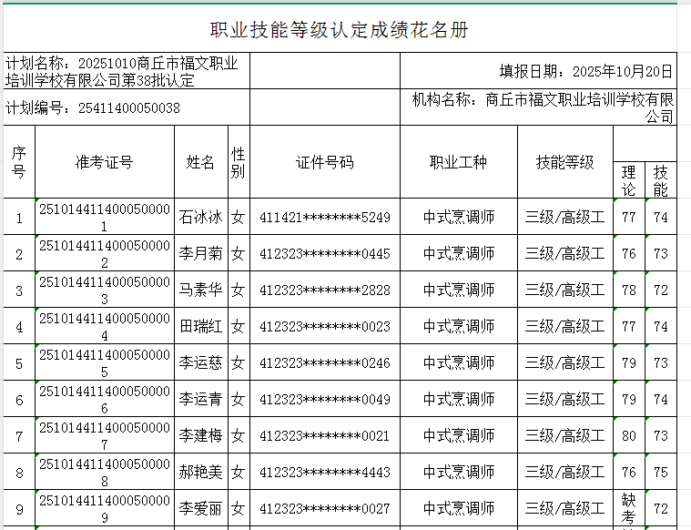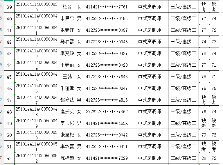 按照《人力资源按照《人力资源和社会保障部职业技能等级认定工作规程(试行)》相关规定,现将2025年10月14日中式烹调师职业技能等级认定考试成绩