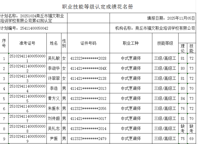 按照《人力资源按照《人力资源和社会保障部职业技能等级认定工作规程(试行)》相关规定,现将2025年10月29日中式烹调师职业技能等级认定考试成绩