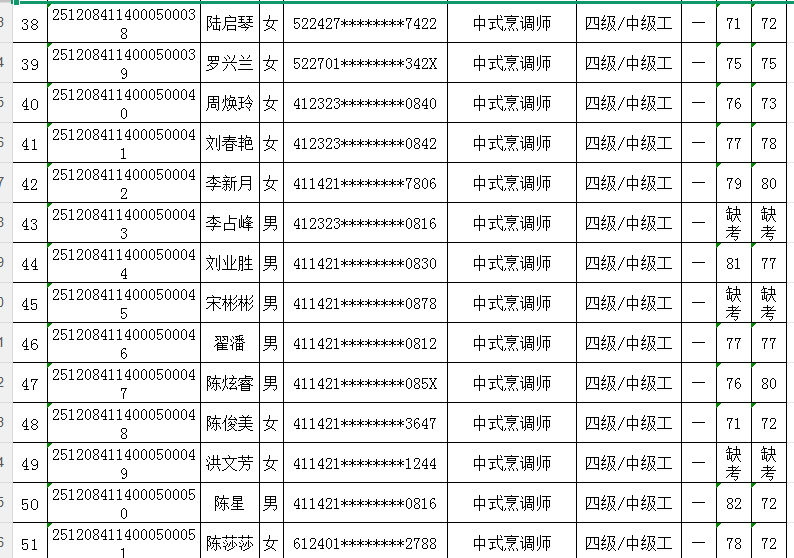 按照《人力资源按照《人力资源和社会保障部职业技能等级认定工作规程(试行)》相关规定,现将2025年12月08日中式烹调师职业技能等级认定考试成绩