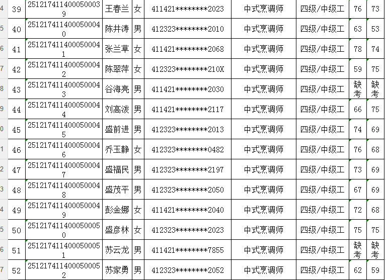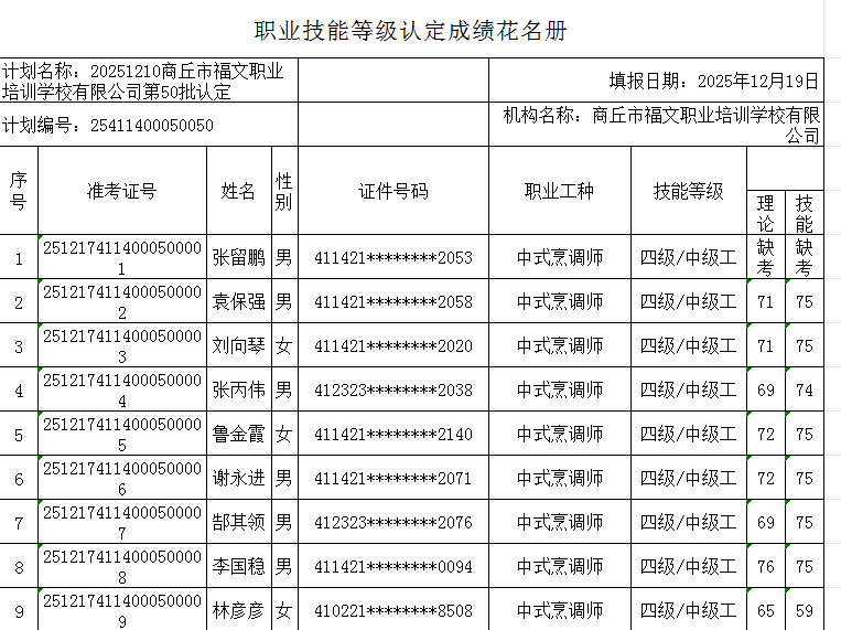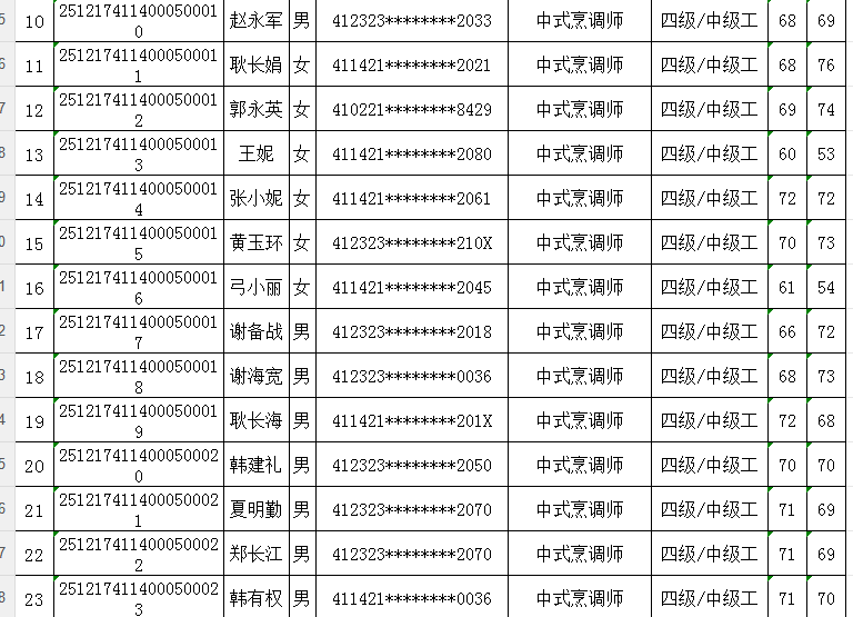 按照《人力资源按照《人力资源和社会保障部职业技能等级认定工作规程(试行)》相关规定,现将2025年12月17日中式烹调师职业技能等级认定考试成绩