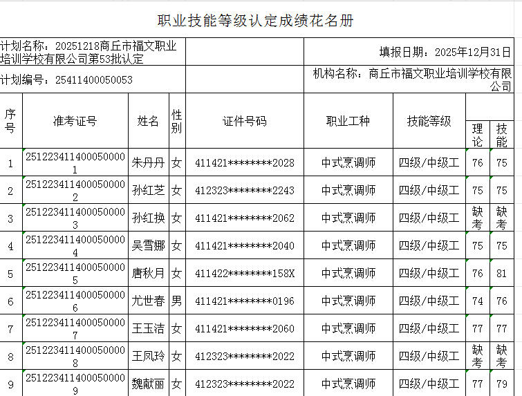 按照《人力资源按照《人力资源和社会保障部职业技能等级认定工作规程(试行)》相关规定,现将2025年12月23日中式烹调师职业技能等级认定考试成绩